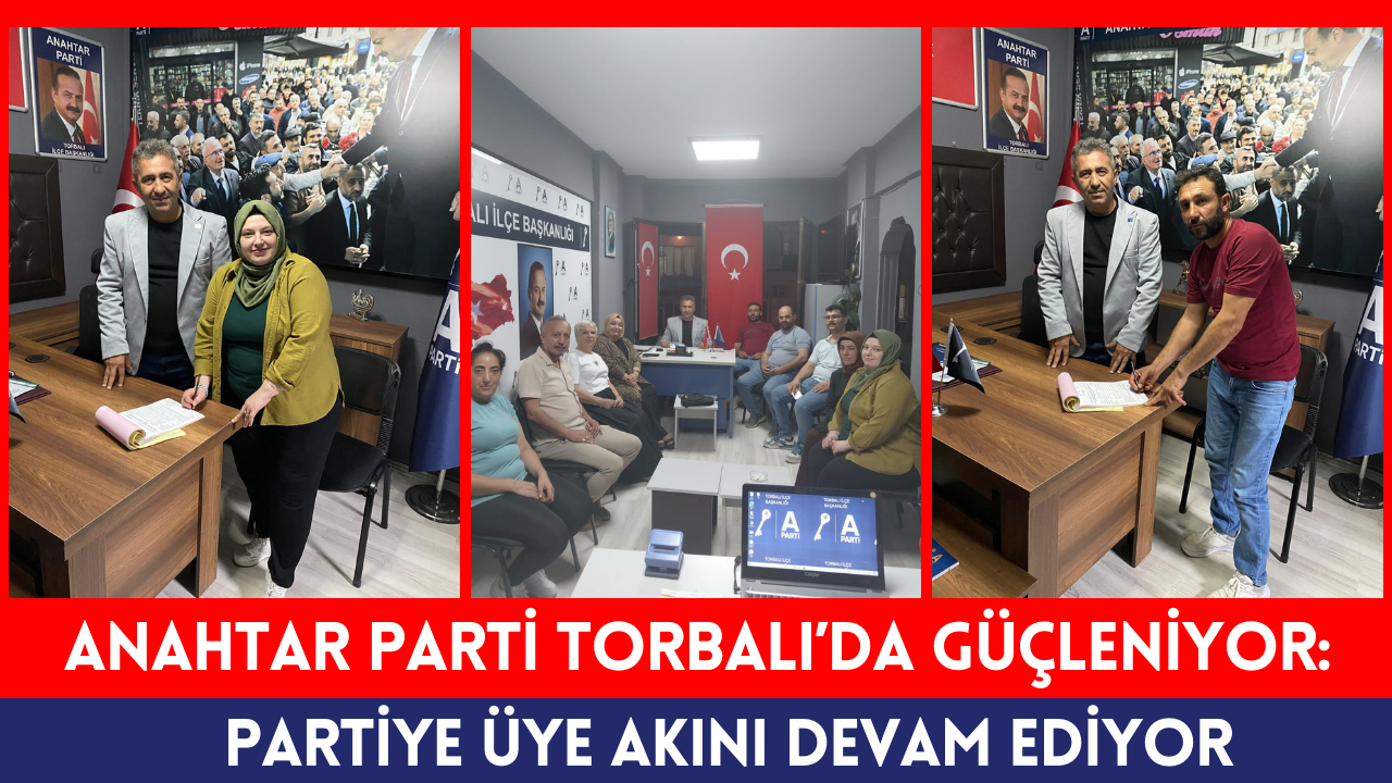 Yeni üyelerin kayıt işlemleri Anahtar Parti Torbalı İlçe Başkanı Osman Tosun tarafından gerçekleştirildi. Tosun, yaptığı açıklamada, üye çalışmalarına hız kesmeden devam edeceklerini ve Torbalı’da partilerini daha geniş bir kitleye tanıtmayı hedeflediklerini söyledi. Anahtar Parti Torbalı İlçe Başkanı Osman Tosun yaptığı açıklamada “Partimize yeni katılan arkadaşlarımıza teşekkür ederim. Torbalı Anahtar Parti ailesi olarak büyümeye devam ediyoruz. Önceliğimiz kalplerin anahtarı olmak” ifadelerini kullandı.