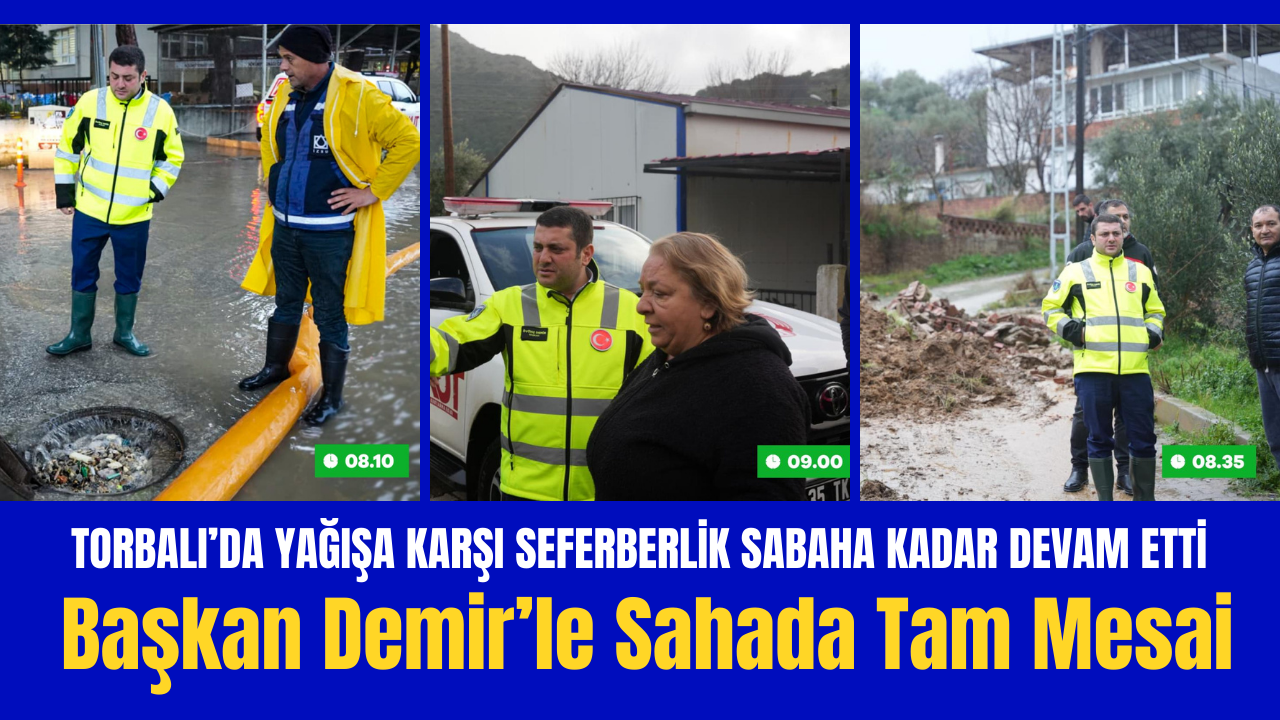 Torbalı’da iki gündür etkili olan yoğun yağışlar nedeniyle Torbalı Belediyesi tüm ekipleriyle sahaya indi. Vatandaşların işlerine, çocukların ise okullarına sorunsuz bir şekilde ulaşabilmesi için gece boyunca çalışmalarını sürdüren belediye ekipleri, ilçede yaşanan sorunların büyük bölümünü kısa sürede çözüme kavuşturdu. Yağışın etkili olduğu noktalarda anında müdahalede bulunan ekipler, birkaç bölgede çalışmalarını sürdürürken, Torbalı Belediye Başkanı Övünç Demir de sahada yer alarak çalışmaları bizzat koordine etti. Başkan Demir, ekiplerle birlikte sahada incelemelerde bulunarak sürecin hızlı ve etkili şekilde yürütülmesini sağladı.