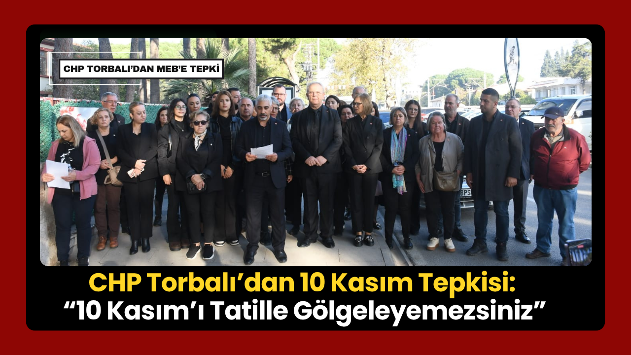 Cumhuriyet Halk Partisi (CHP) Torbalı İlçe Örgütü, 10 Kasım Atatürk’ü Anma Günü’nün ara tatile denk getirilmesine tepki göstermek amacıyla Kazımpaşa İlkokulu önünde bir basın açıklaması gerçekleştirdi. Programa, CHP Torbalı İlçe Başkanı İbrahim Özel, Torbalı Belediyesi Meclis Üyeleri, ilçe yöneticileri, partililer ve vatandaşlar katıldı. Katılımcılar “Atamızı unutturamazsınız” mesajı verirken, yapılan açıklamada Milli Eğitim Bakanlığı’nın 10 Kasım’ı ara tatile denk getirmesinin bilinçli bir tercih olduğu vurgulandı.