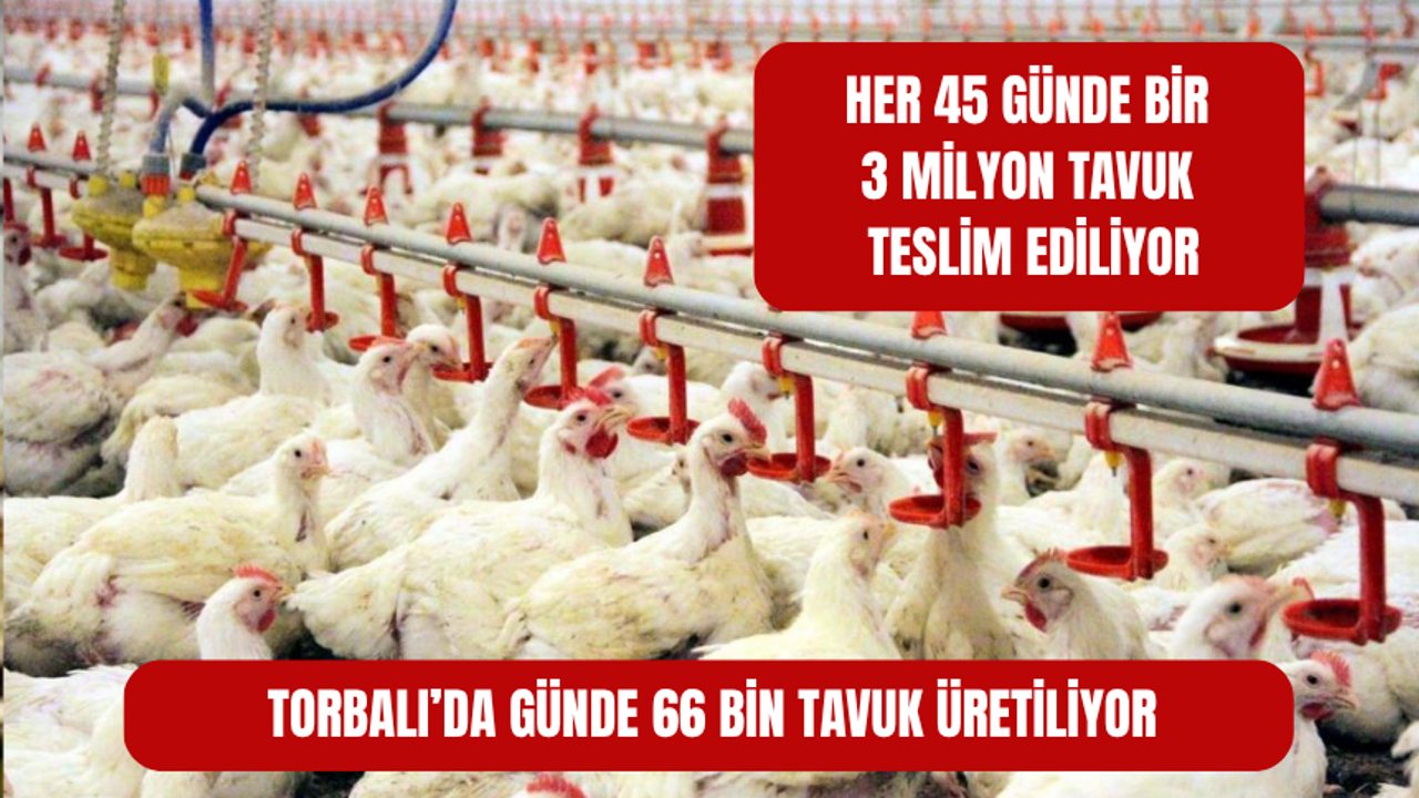 Tavuk çiftliklerinde yumurtadan çıkan civcivlerin firmalara teslim edilecek büyüklüğe ulaşması için yaklaşık 45 günlük bir süreç gerekiyor. Torbalı genelindeki çiftliklerde yetiştirilip her 45 günde beyaz et firmalarına teslim edilen tavuk sayısı 3 milyona ulaşıyor. Bu da günlük ortalama 66 bin tavuk üretimi anlamına geliyor.