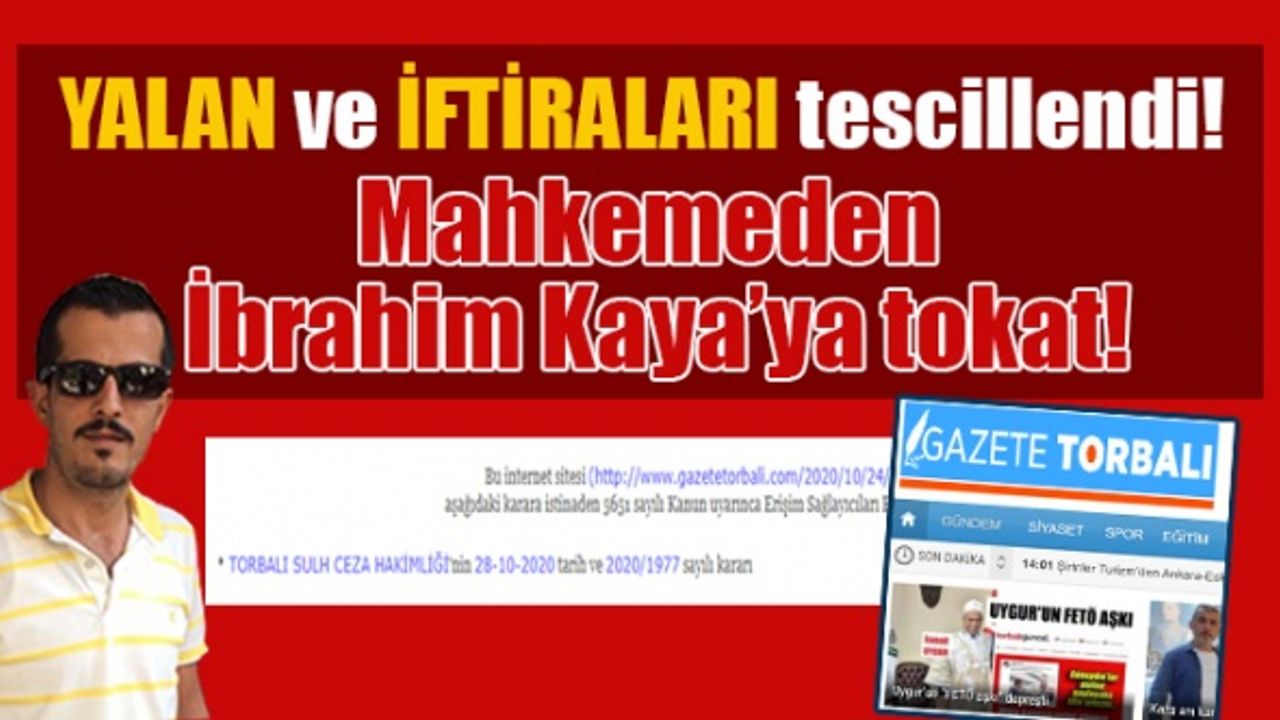 Sık sık yaptığı yalan haberler, iftiralar ve yersiz yakıştırmaları ile bilinen İbrahim Kaya’ya mahkeme de ‘Dur’ dedi. Daha önce yaptığı haberler nedeniyle cezaevinde bile yatan Kaya, son olarak Torbalı Belediye Başkanı İsmail Uygur için ‘FETÖ’cü’ yakıştırmasında bulunmuştu. ‘Uygur’un FETÖ aşkı depreşti’ başlıklı asılsız haberi ile İbrahim Kaya’ya Torbalı Sulh Ceza Mahkemesi erişim engeli kararı verdi. http://www.gazetetorbali.com/2020/10/24/uygurun-feto-aski-depresti/ URL Erişim Sağlayıcıları Birliği tarafından erişime kapatıldı. Kaya’nın böylelikle bir kez daha iftiraya başvurduğu tescillendi.