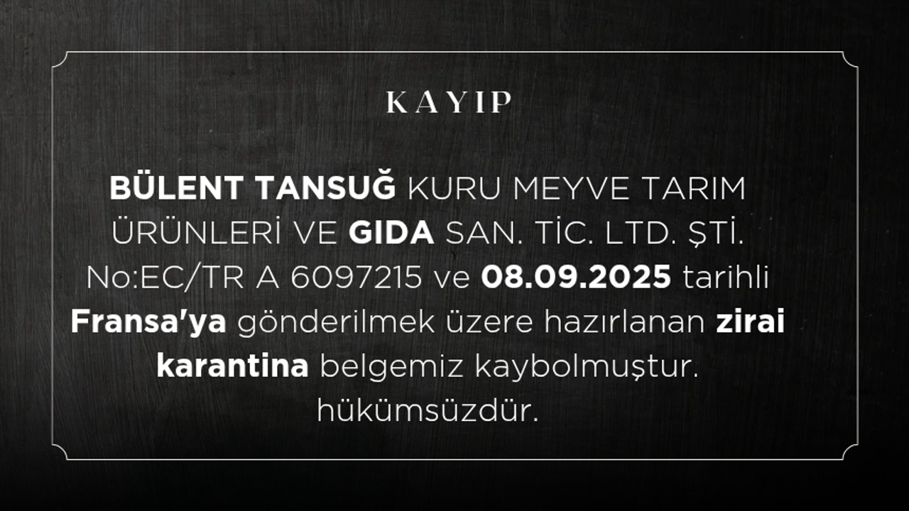 BÜLENT TANSUĞ KURU MEYVE TARIM ÜRÜNLERİ VE GIDA SAN. TİC. LTD. ŞTİ. No:EC/TR A 6097215 ve 08.09.2025 tarihli Fransa'ya gönderilmek üzere hazırlanan zirai karantina belgemiz kaybolmuştur. hükümsüzdür.