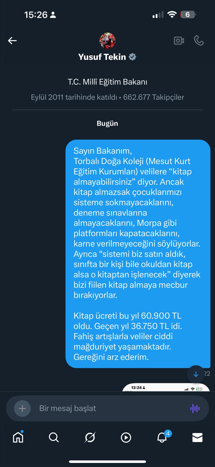 Veliler, sosyal medya platformu X üzerinden Bakan Tekin’e mesaj göndererek yaşadıkları mağduriyeti anlattı. Velilerin mesajında, kitap alınmadığı takdirde öğrencilerin sisteme dahil edilmeyeceği, deneme sınavlarına alınmayacağı, Morpa gibi platformların kapatılacağı ve karne verilmeyeceği yönünde okul yönetimi tarafından baskı yapıldığı öne sürüldü.