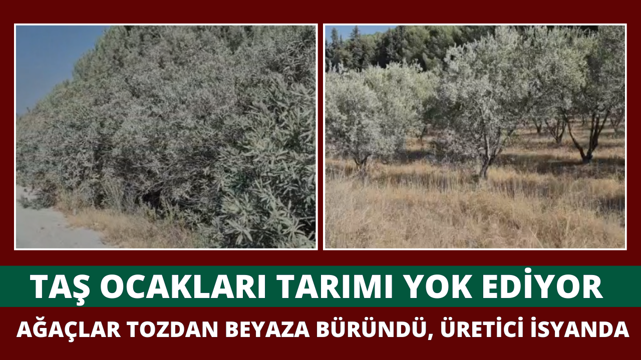 Torbalı’nın en büyük sorunlarından biri olan taş ocakları, hem doğaya hem de tarım arazilerine ciddi zarar vermeye devam ediyor. İlçenin özellikle Özbey bölgesinde yoğunlaşan ocaklar, bölgedeki ormanlık alanları yok ederken, tarımsal üretimi de olumsuz etkiliyor. Taş ocaklarında yapılan çalışmalar sırasında ortaya çıkan yoğun toz, çevredeki ağaçların ve tarım ürünlerinin üzerine adeta yağıyor. Normalde yemyeşil görünmesi gereken zeytin ağaçları, toz tabakası nedeniyle bembeyaz bir görüntüye bürünmüş durumda. Aynı şekilde çam ağaçları ve mevsimlik ürünler de bu kirlilikten nasibini alıyor.