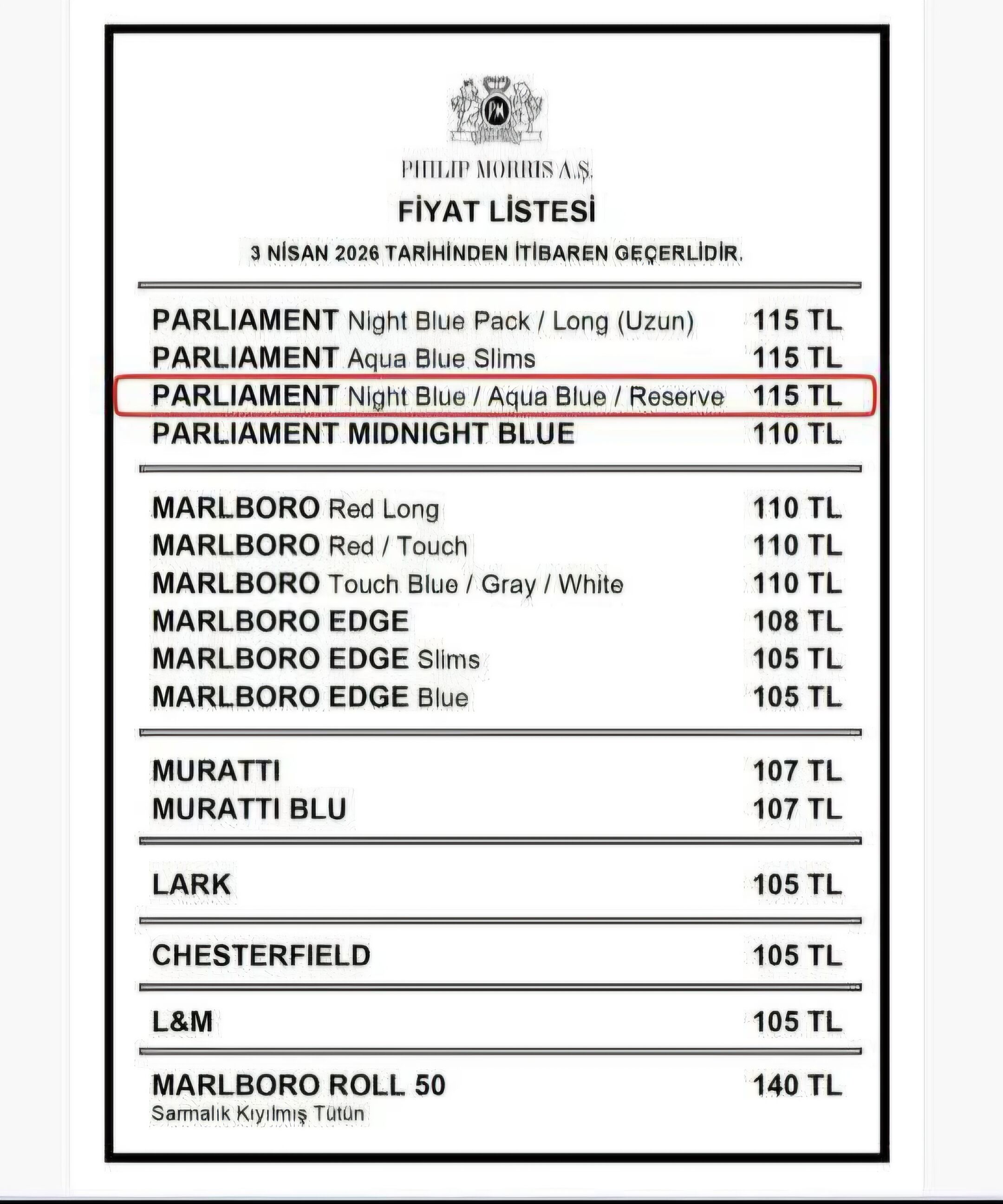 Sigara fiyatlarına yeni bir artış daha geldi. Son düzenlemeyle zam yalnızca belirli bir markayı kapsadığı belirtildi. Tekel Bayileri Platform Başkanı Özgür Aybaş, Philip Morris grubundaki Parliament Night Blue, Aqua Blue ve Reserve grubunun fiyatına 5 TL eklendi. Philip Morris grubundaki sigaralarda fiyat artışı sonrası güncel liste yeniden gündeme geldi. Kamuya açık güncel fiyat listelerinde grubun en düşük fiyatlı ürünleri 105 TL, en yüksek fiyatlı ürünleri ise 115 TL seviyesinde yer alıyor.
