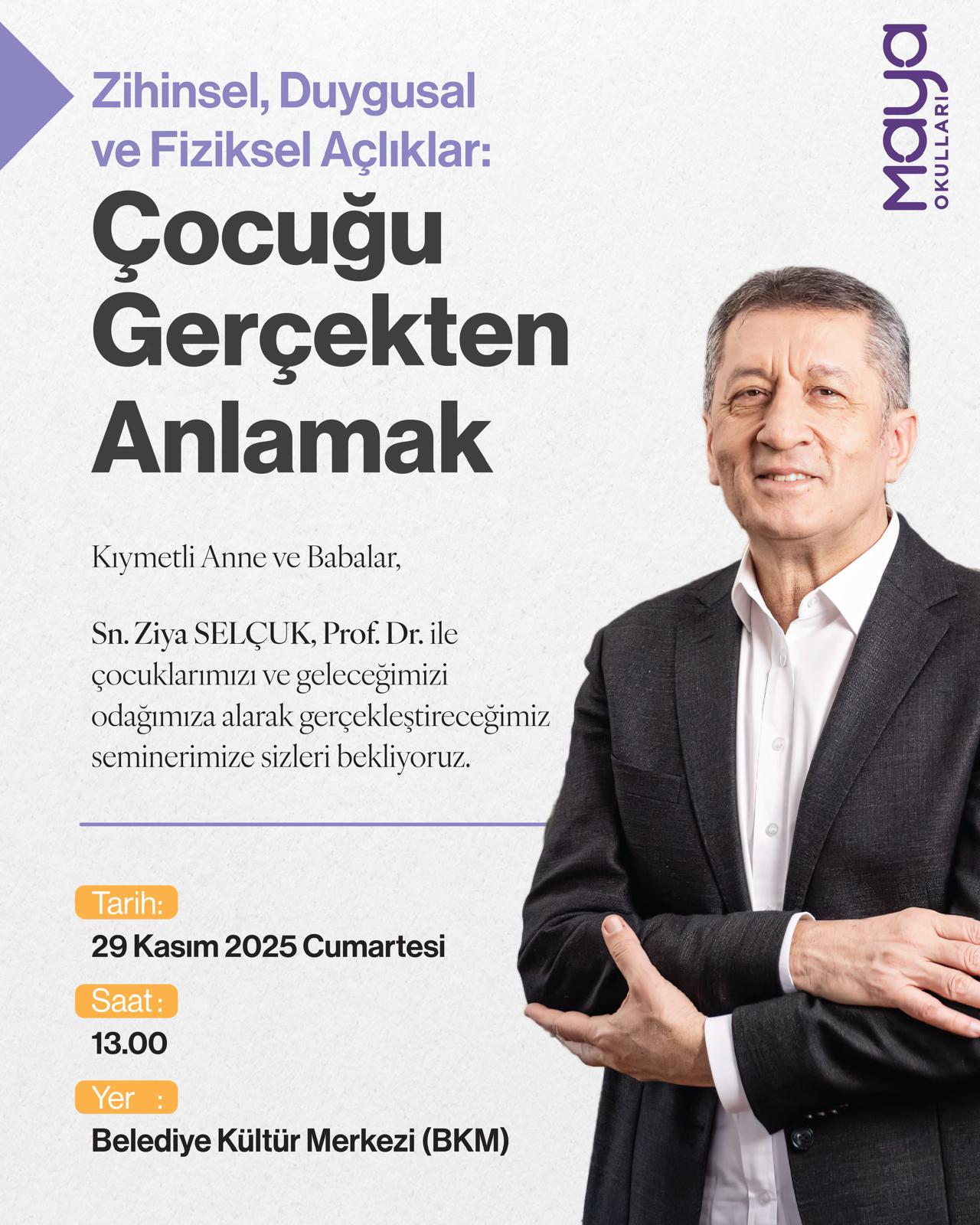 Özel Maya Çocuk Anaokulu, çocukların gelişim süreçlerini daha iyi anlamak amacıyla önemli bir etkinliğe imza atıyor. Eski Millî Eğitim Bakanı, eğitimci ve akademisyen Prof. Dr. Ziya Selçuk, Torbalı’da veliler ve tüm vatandaşlarla bir araya gelecek.