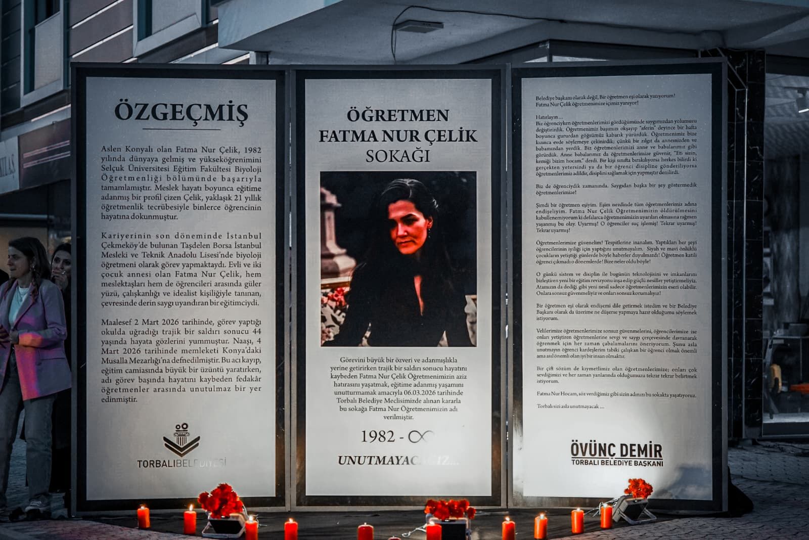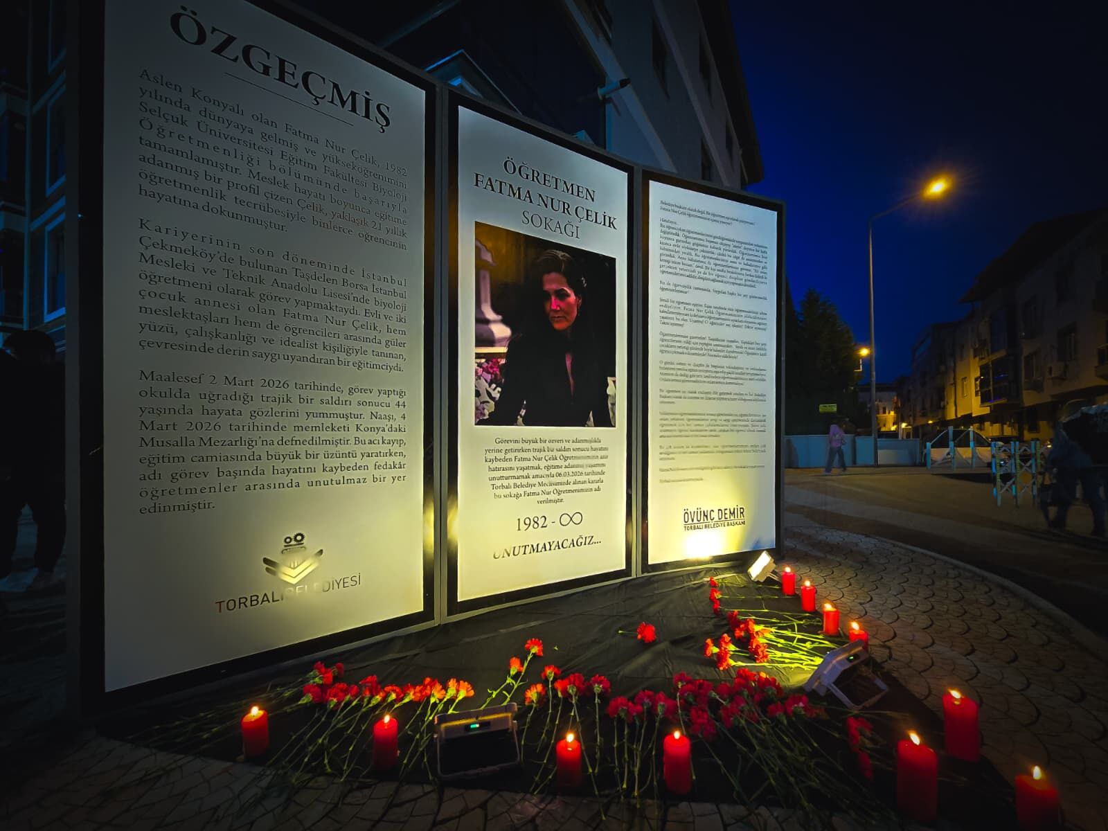 Torbalı’da görevi başında hayatını kaybeden Biyoloji Öğretmeni Fatma Nur Çelik’in hatırası yaşatılmaya başlandı. Önceki gün gerçekleşen Torbalı Belediyesi Mart Ayı Olağan Meclisi’nde alınan kararın ardından Alpkent Mahallesi’nde bulunan 1032. Sokak, düzenlenen törenle “Öğretmen Fatma Nur Çelik Sokağı” olarak açıldı. Türkiye’de bu öğretmen için yapılan ilk anlamlı adım olma özelliği taşıyan uygulama, ilçede büyük takdir topladı. Düzenlenen törende sokağa yeni tabela monte edilirken, öğretmenin öz geçmişinin yer aldığı ve Torbalı Belediye Başkanı Övünç Demir’in mesajını içeren özel bir anı panosu da hazırlandı. Törene katılan vatandaşlar, öğretmenin anısını yaşatmak için panonun önüne karanfiller bırakarak duygu dolu anlar yaşadı.
